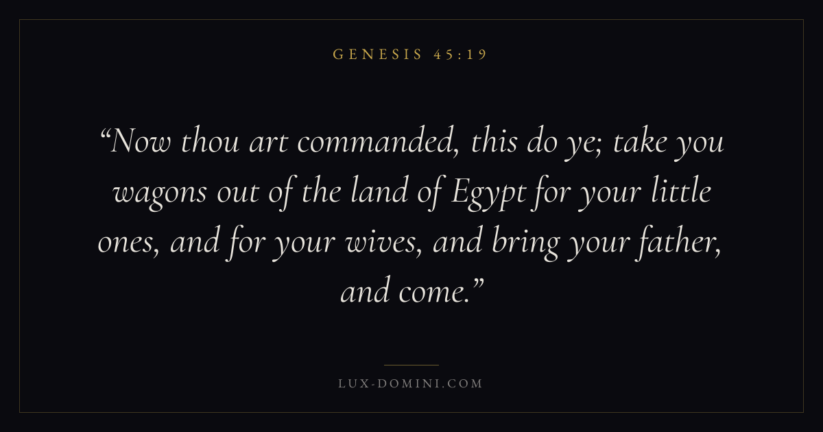 Now thou art commanded, this do ye; take you wagons out of the land of Egypt for your little ones, and for your wives, and bring your father, and come.
