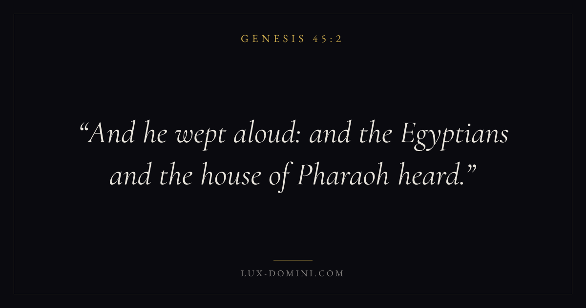 Books / Genesis / Chapter 45 / Verse 2 ← Genesis 45:1 Genesis 45:2 Genesis 45:3 → And he wept aloud: and the Egyptians and the house of Pharaoh heard. Download verse card Share on Twitter Share on Facebook Pin it ✦ Key themes HopeCreationFallCovenant Read with Genesis 45:1Genesis 45:3Romans 8:24Revelation 21:4 Related topics Bible verses about hope ✦ Genesis Chapter 45 verses V. 1 V. 2 V. 3 V. 4 V. 5 V. 6 V. 7 V. 8 V. 9 V. 10 V. 11 V. 12 V. 13 V. 14 V. 15 V. 16 V. 17 V. 18 V. 19 V. 20 V. 21 V. 22 V. 23 V. 24 V. 25 V. 26 V. 27 V. 28