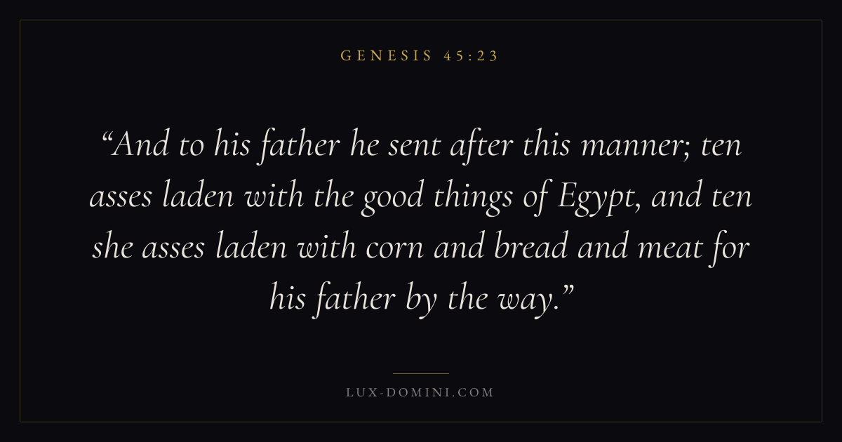And to his father he sent after this manner; ten asses laden with the good things of Egypt, and ten she asses laden with corn and bread and meat for his father by the way.