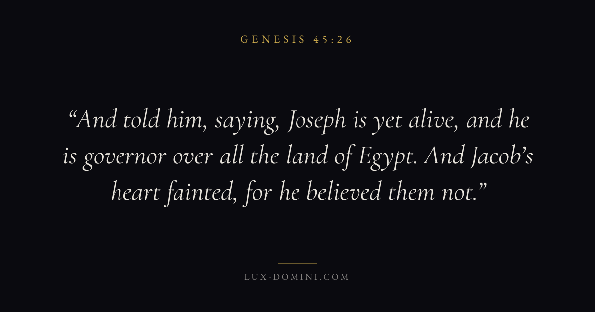 And told him, saying, Joseph is yet alive, and he is governor over all the land of Egypt. And Jacob’s heart fainted, for he believed them not.