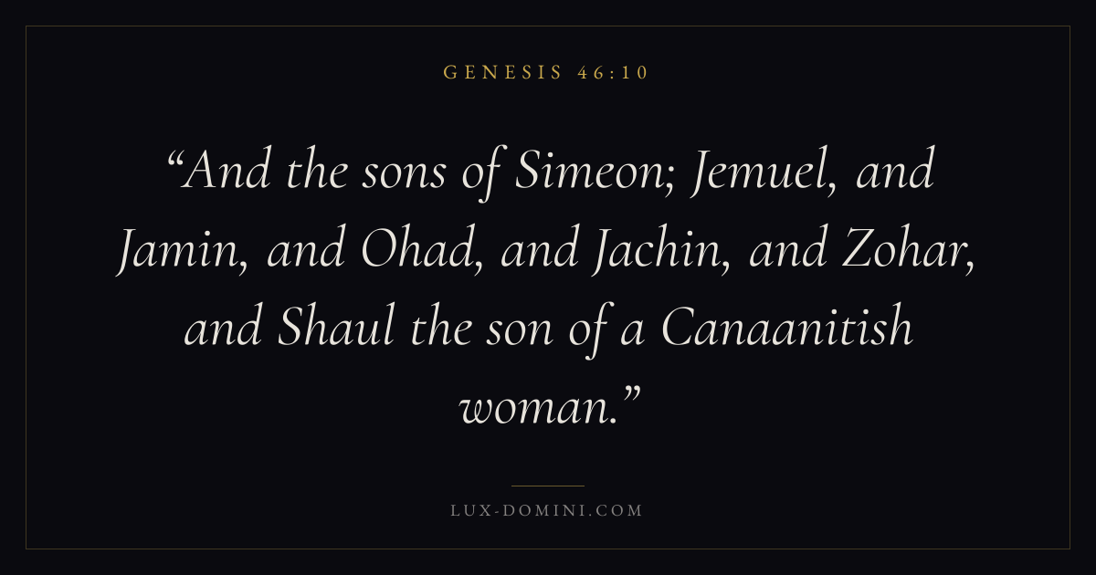 And the sons of Simeon; Jemuel, and Jamin, and Ohad, and Jachin, and Zohar, and Shaul the son of a Canaanitish woman.