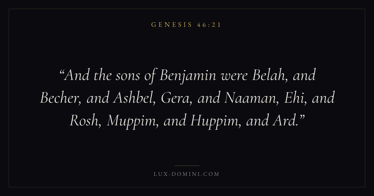 And the sons of Benjamin were Belah, and Becher, and Ashbel, Gera, and Naaman, Ehi, and Rosh, Muppim, and Huppim, and Ard.