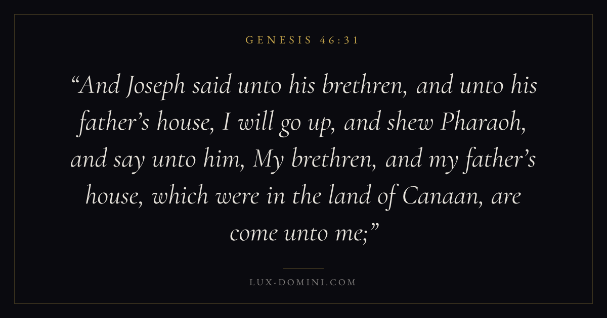 And Joseph said unto his brethren, and unto his father’s house, I will go up, and shew Pharaoh, and say unto him, My brethren, and my father’s house, which were in the land of Canaan, are come unto me;