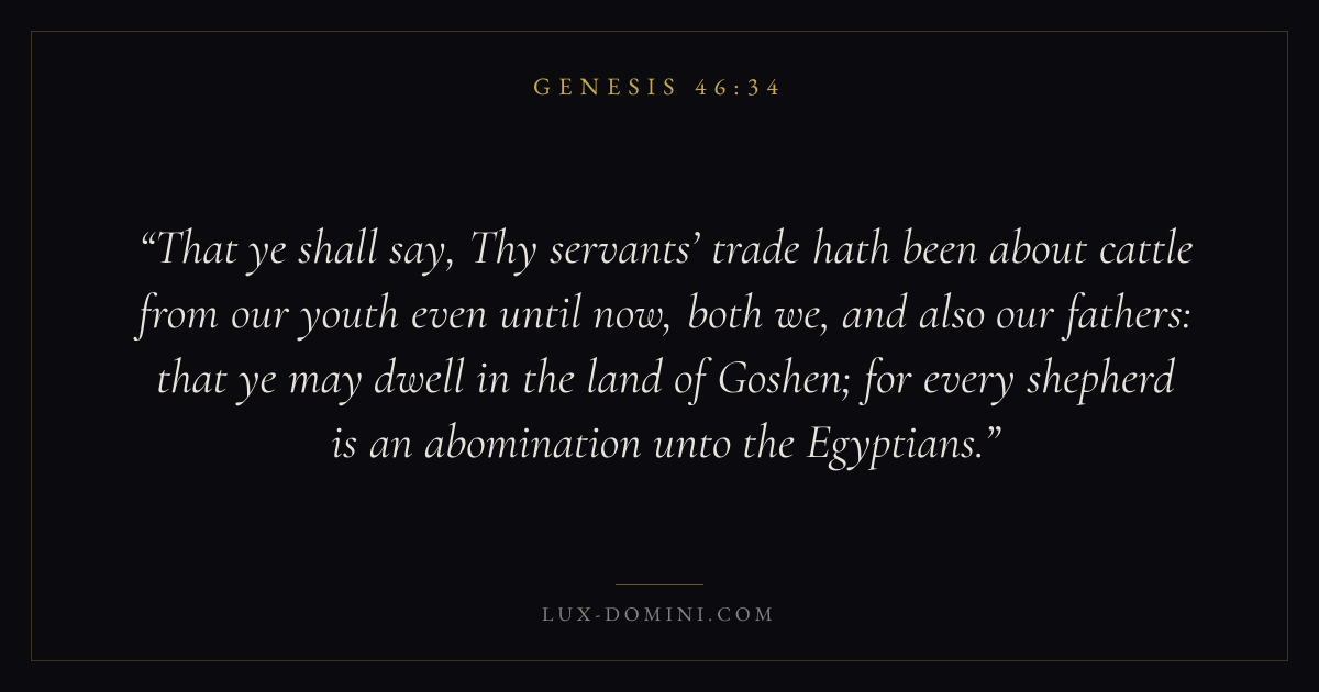 That ye shall say, Thy servants’ trade hath been about cattle from our youth even until now, both we, and also our fathers: that ye may dwell in the land of Goshen; for every shepherd is an abomination unto the Egyptians.