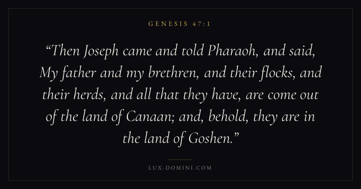 Then Joseph came and told Pharaoh, and said, My father and my brethren, and their flocks, and their herds, and all that they have, are come out of the land of Canaan; and, behold, they are in the land of Goshen.