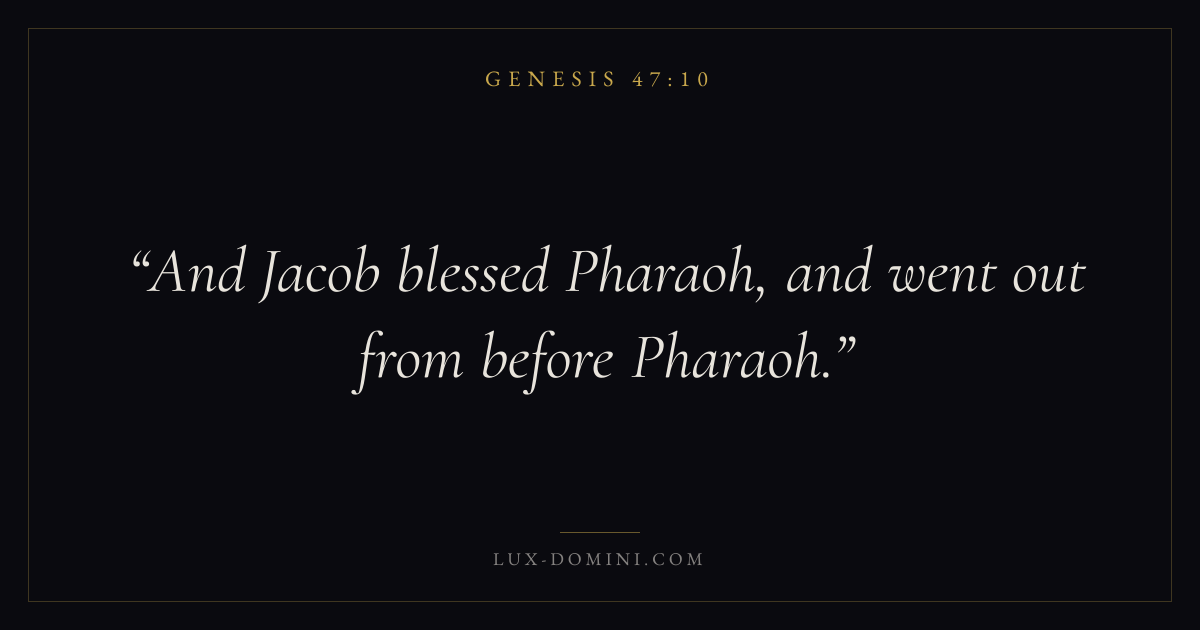 Books / Genesis / Chapter 47 / Verse 10 ← Genesis 47:9 Genesis 47:10 Genesis 47:11 → And Jacob blessed Pharaoh, and went out from before Pharaoh. Download verse card Share on Twitter Share on Facebook Pin it ✦ Key themes HopeTruthCreationFall Read with Genesis 47:9Romans 8:24Revelation 21:4John 14:6 Related topics Bible verses about hopeBible verses about truth ✦ Genesis Chapter 47 verses V. 1 V. 2 V. 3 V. 4 V. 5 V. 6 V. 7 V. 8 V. 9 V. 10 V. 11 V. 12 V. 13 V. 14 V. 15 V. 16 V. 17 V. 18 V. 19 V. 20 V. 21 V. 22 V. 23 V. 24 V. 25 V. 26 V. 27 V. 28 V. 29 V. 30 V. 31