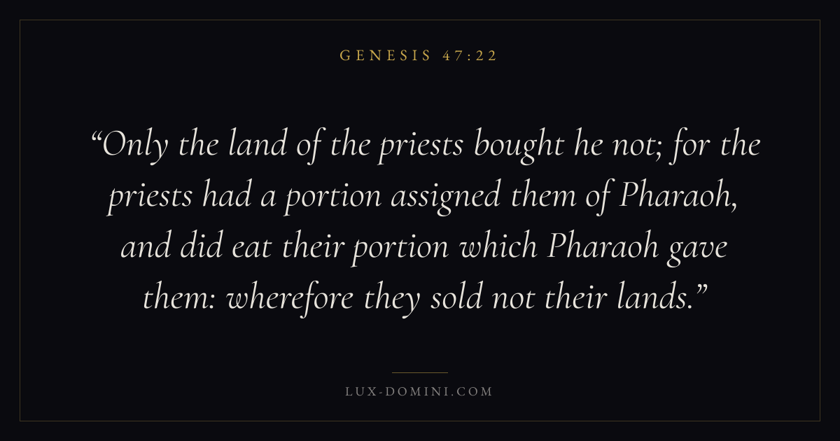 Only the land of the priests bought he not; for the priests had a portion assigned them of Pharaoh, and did eat their portion which Pharaoh gave them: wherefore they sold not their lands.