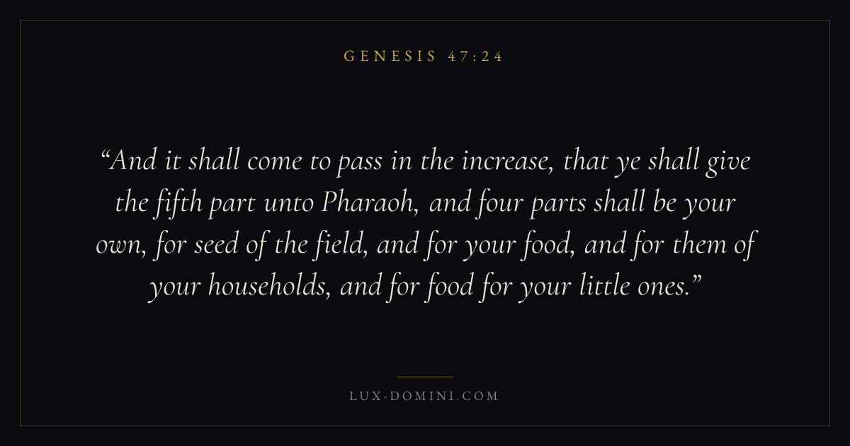 And it shall come to pass in the increase, that ye shall give the fifth part unto Pharaoh, and four parts shall be your own, for seed of the field, and for your food, and for them of your households, and for food for your little ones.