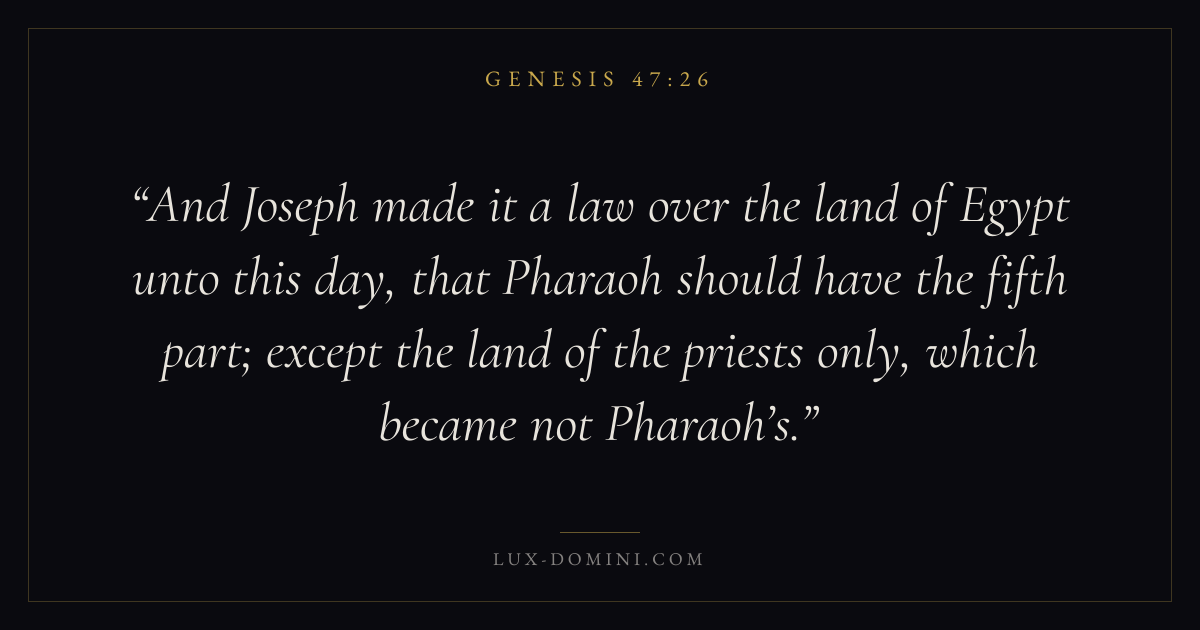 And Joseph made it a law over the land of Egypt unto this day, that Pharaoh should have the fifth part; except the land of the priests only, which became not Pharaoh’s.
