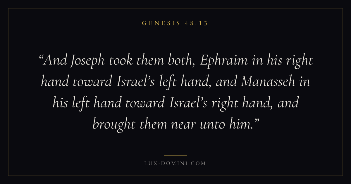 And Joseph took them both, Ephraim in his right hand toward Israel’s left hand, and Manasseh in his left hand toward Israel’s right hand, and brought them near unto him.
