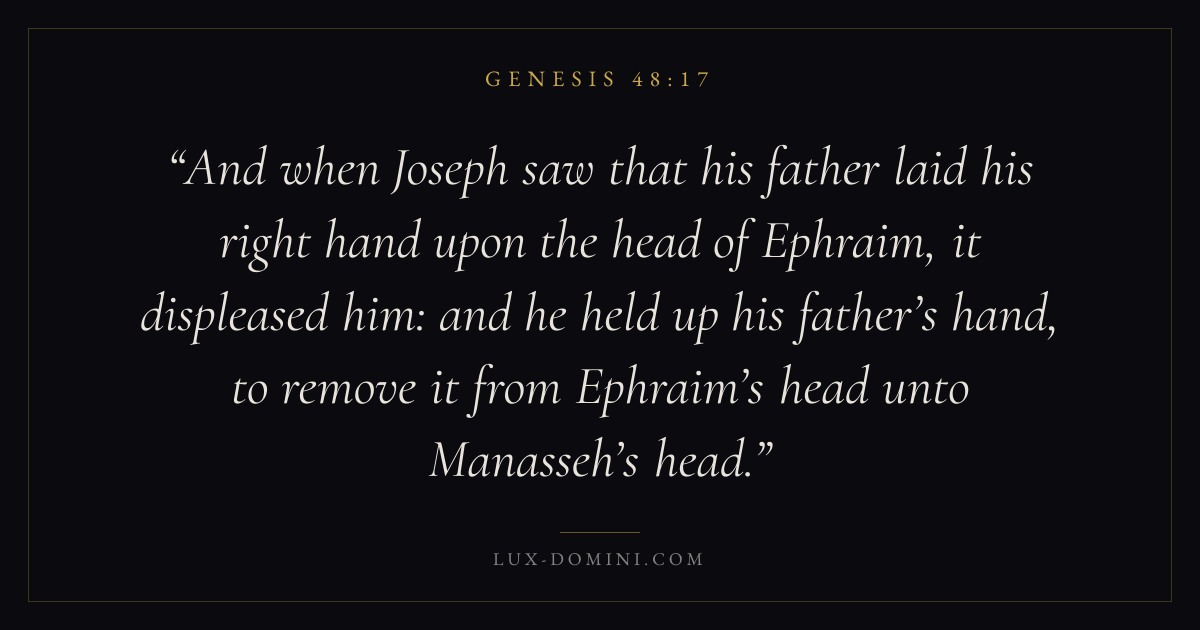 And when Joseph saw that his father laid his right hand upon the head of Ephraim, it displeased him: and he held up his father’s hand, to remove it from Ephraim’s head unto Manasseh’s head.