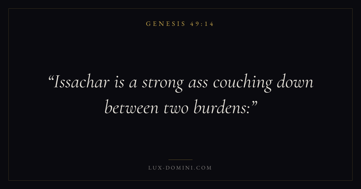 Books / Genesis / Chapter 49 / Verse 14 ← Genesis 49:13 Genesis 49:14 Genesis 49:15 → Issachar is a strong ass couching down between two burdens: Download verse card Share on Twitter Share on Facebook Pin it ✦ Key themes HopeCreationFallCovenant Read with Genesis 49:15Romans 8:24Revelation 21:4 Related topics Bible verses about hope ✦ Genesis Chapter 49 verses V. 1 V. 2 V. 3 V. 4 V. 5 V. 6 V. 7 V. 8 V. 9 V. 10 V. 11 V. 12 V. 13 V. 14 V. 15 V. 16 V. 17 V. 18 V. 19 V. 20 V. 21 V. 22 V. 23 V. 24 V. 25 V. 26 V. 27 V. 28 V. 29 V. 30 V. 31 V. 32 V. 33