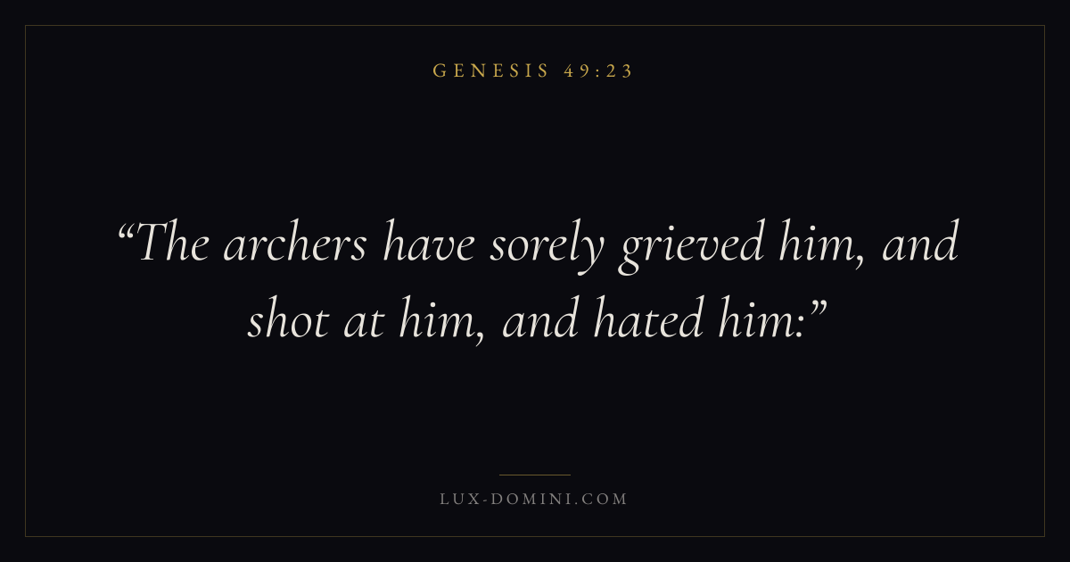 Books / Genesis / Chapter 49 / Verse 23 ← Genesis 49:22 Genesis 49:23 Genesis 49:24 → The archers have sorely grieved him, and shot at him, and hated him: Download verse card Share on Twitter Share on Facebook Pin it ✦ Key themes HopeCreationFallCovenant Read with Genesis 49:22Genesis 49:24Romans 8:24Revelation 21:4 Related topics Bible verses about hope ✦ Genesis Chapter 49 verses V. 1 V. 2 V. 3 V. 4 V. 5 V. 6 V. 7 V. 8 V. 9 V. 10 V. 11 V. 12 V. 13 V. 14 V. 15 V. 16 V. 17 V. 18 V. 19 V. 20 V. 21 V. 22 V. 23 V. 24 V. 25 V. 26 V. 27 V. 28 V. 29 V. 30 V. 31 V. 32 V. 33