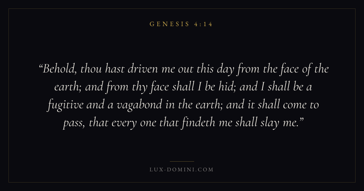 Behold, thou hast driven me out this day from the face of the earth; and from thy face shall I be hid; and I shall be a fugitive and a vagabond in the earth; and it shall come to pass, that every one that findeth me shall slay me.