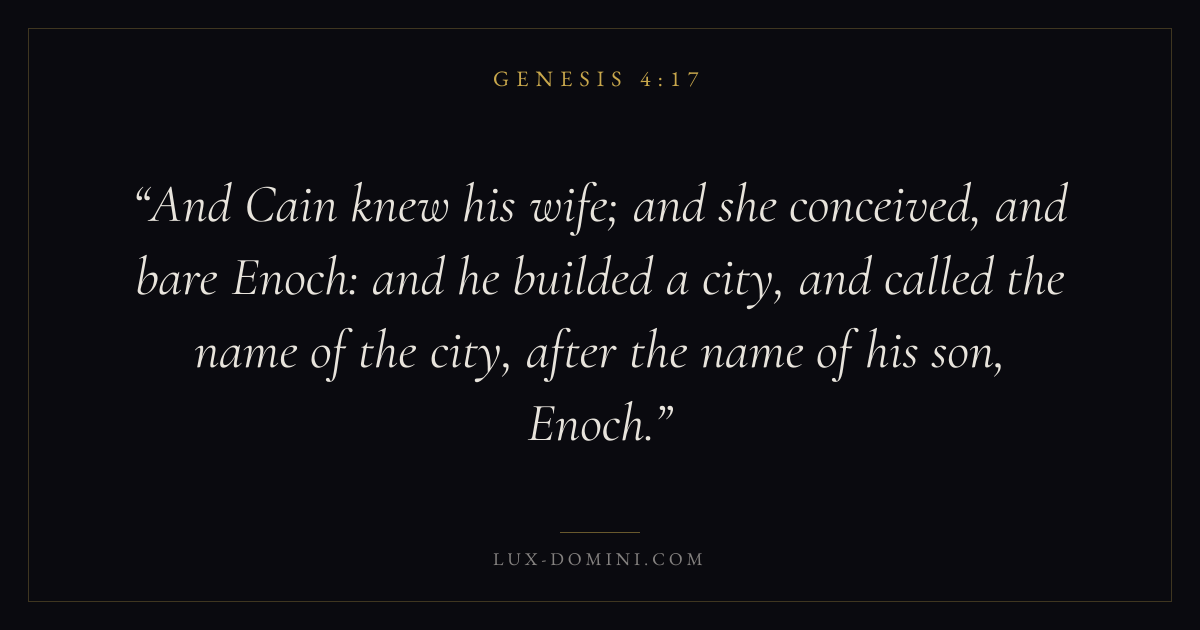 And Cain knew his wife; and she conceived, and bare Enoch: and he builded a city, and called the name of the city, after the name of his son, Enoch.