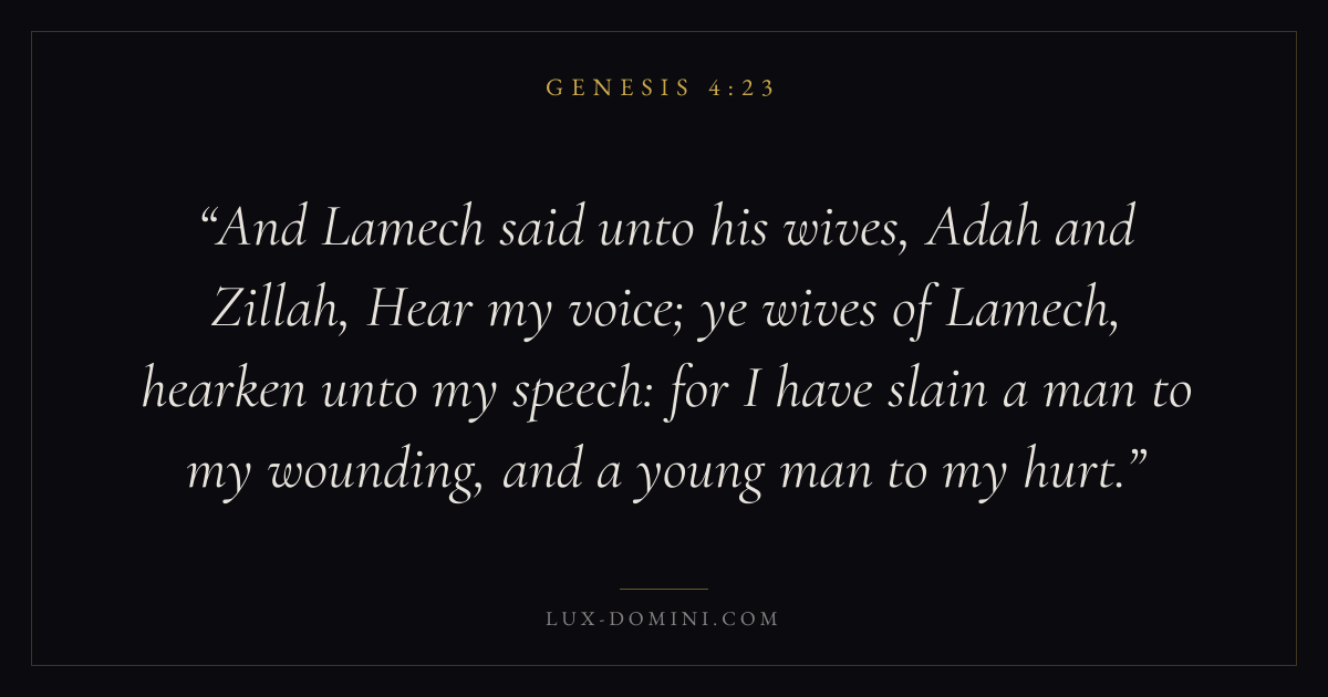 And Lamech said unto his wives, Adah and Zillah, Hear my voice; ye wives of Lamech, hearken unto my speech: for I have slain a man to my wounding, and a young man to my hurt.
