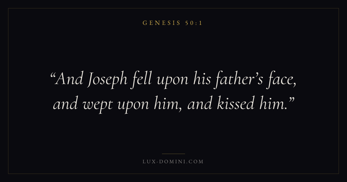Books / Genesis / Chapter 50 / Verse 1 ← Genesis 49:33 Genesis 50:1 Genesis 50:2 → And Joseph fell upon his father’s face, and wept upon him, and kissed him. Download verse card Share on Twitter Share on Facebook Pin it ✦ Key themes HopeGraceCreationFall Read with Genesis 50:2Genesis 50:3Romans 8:24Revelation 21:4 Related topics Bible verses about hopeBible verses about grace ✦ Genesis Chapter 50 verses V. 1 V. 2 V. 3 V. 4 V. 5 V. 6 V. 7 V. 8 V. 9 V. 10 V. 11 V. 12 V. 13 V. 14 V. 15 V. 16 V. 17 V. 18 V. 19 V. 20 V. 21 V. 22 V. 23 V. 24 V. 25 V. 26
