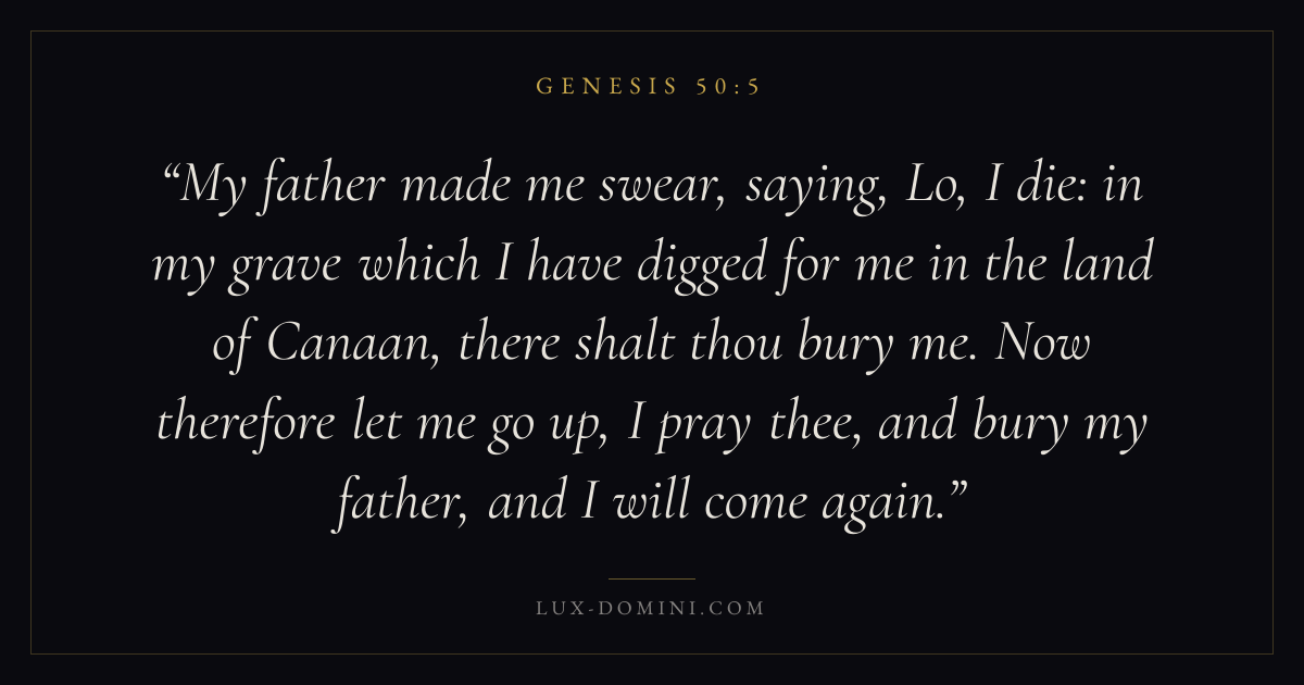 My father made me swear, saying, Lo, I die: in my grave which I have digged for me in the land of Canaan, there shalt thou bury me. Now therefore let me go up, I pray thee, and bury my father, and I will come again.