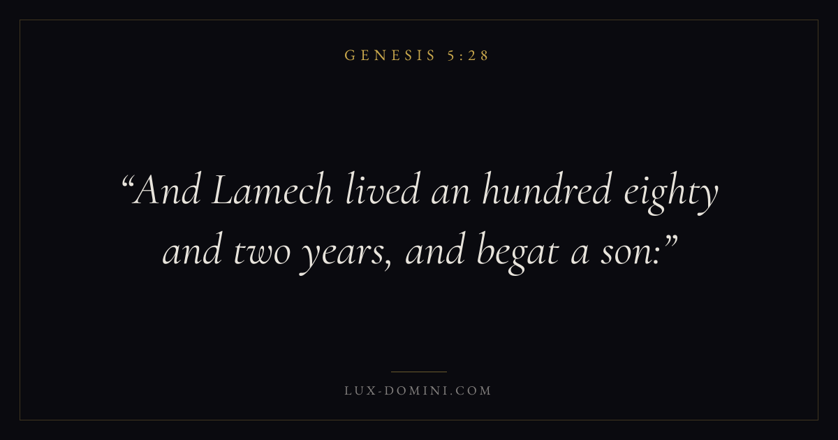 Books / Genesis / Chapter 5 / Verse 28 ← Genesis 5:27 Genesis 5:28 Genesis 5:29 → And Lamech lived an hundred eighty and two years, and begat a son: Download verse card Share on Twitter Share on Facebook Pin it ✦ Key themes HopeCreationFallCovenant Read with Genesis 5:29Genesis 5:30Romans 8:24Revelation 21:4 Related topics Bible verses about hope ✦ Genesis Chapter 5 verses V. 1 V. 2 V. 3 V. 4 V. 5 V. 6 V. 7 V. 8 V. 9 V. 10 V. 11 V. 12 V. 13 V. 14 V. 15 V. 16 V. 17 V. 18 V. 19 V. 20 V. 21 V. 22 V. 23 V. 24 V. 25 V. 26 V. 27 V. 28 V. 29 V. 30 V. 31 V. 32