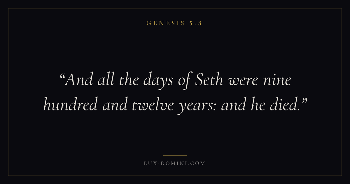 Books / Genesis / Chapter 5 / Verse 8 ← Genesis 5:7 Genesis 5:8 Genesis 5:9 → And all the days of Seth were nine hundred and twelve years: and he died. Download verse card Share on Twitter Share on Facebook Pin it ✦ Key themes HopeCreationFallCovenant Read with Genesis 5:6Genesis 5:7Romans 8:24Revelation 21:4 Related topics Bible verses about hope Glossary Seth Person Appointed; a substitute, the third son of Adam and Eve ( Gen. 4:25 ; 5:3 ). His mother gave him this name, “for God,” said she, “hath appointed me [i. e., compensated me with] another seed instead of Abel, whom Cain slew. ”. ✦ Genesis Chapter 5 verses V. 1 V. 2 V. 3 V. 4 V. 5 V. 6 V. 7 V. 8 V. 9 V. 10 V. 11 V. 12 V. 13 V. 14 V. 15 V. 16 V. 17 V. 18 V. 19 V. 20 V. 21 V. 22 V. 23 V. 24 V. 25 V. 26 V. 27 V. 28 V. 29 V. 30 V. 31 V. 32