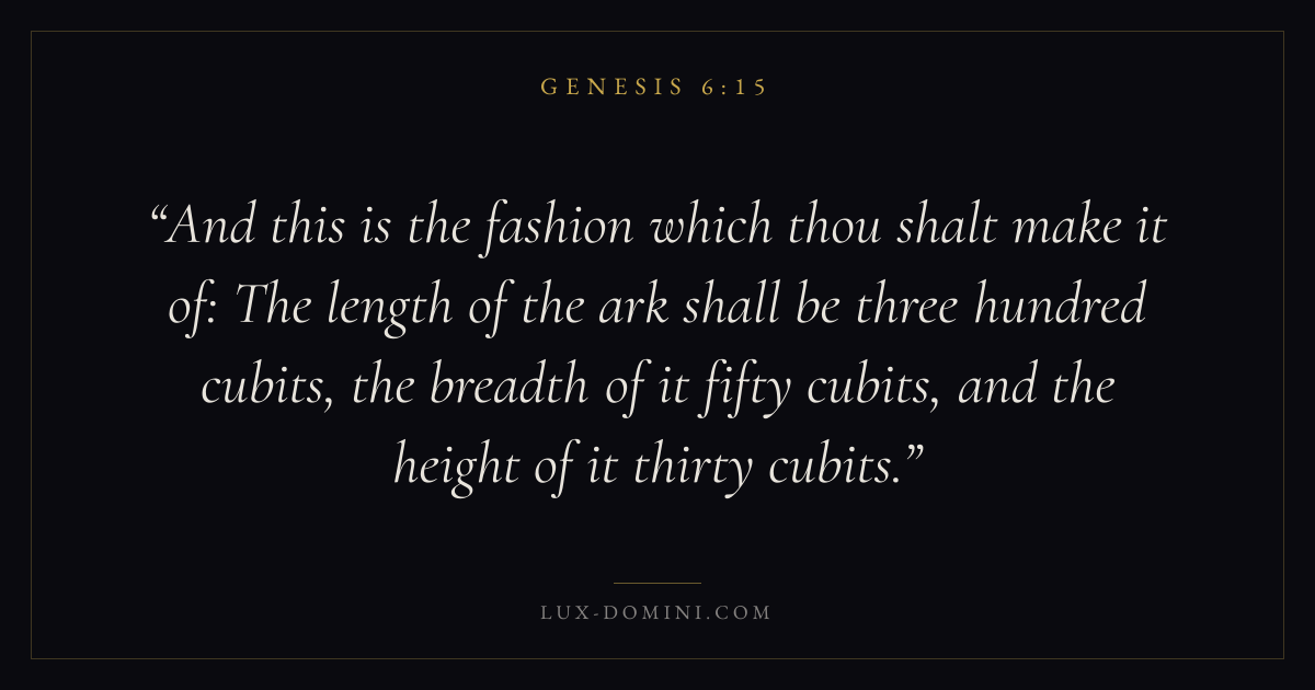 And this is the fashion which thou shalt make it of: The length of the ark shall be three hundred cubits, the breadth of it fifty cubits, and the height of it thirty cubits.