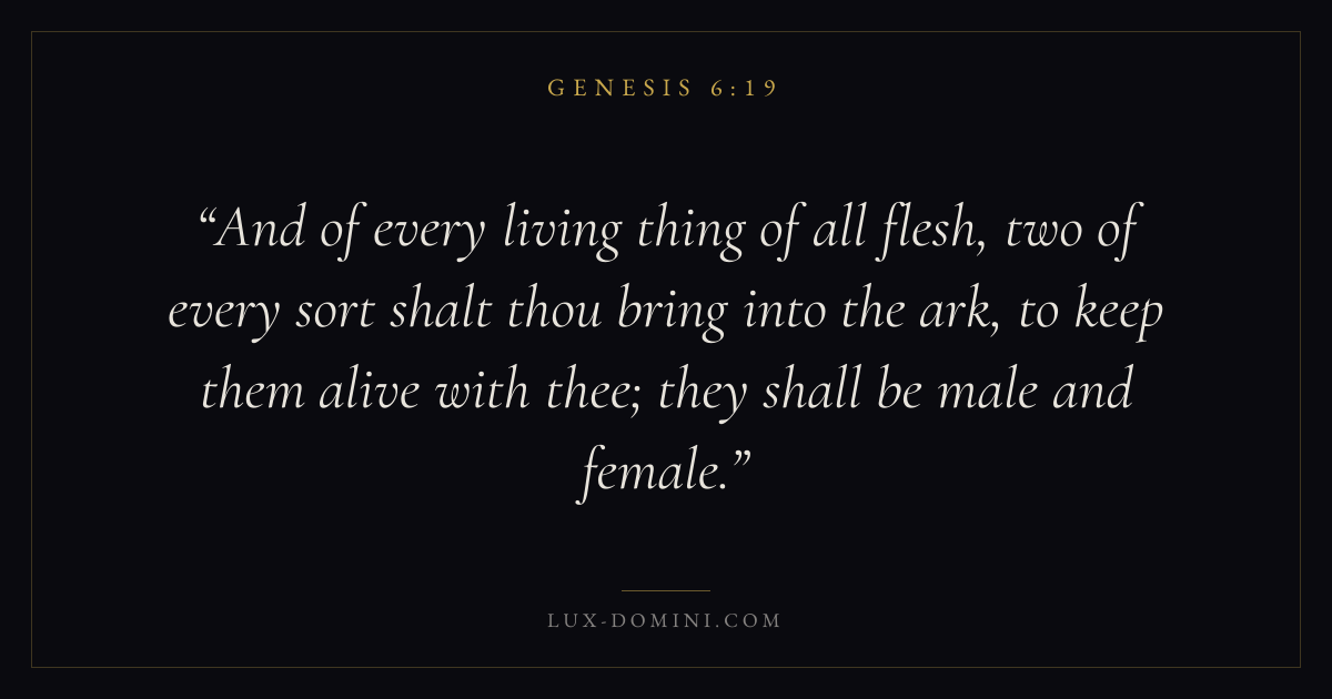 And of every living thing of all flesh, two of every sort shalt thou bring into the ark, to keep them alive with thee; they shall be male and female.
