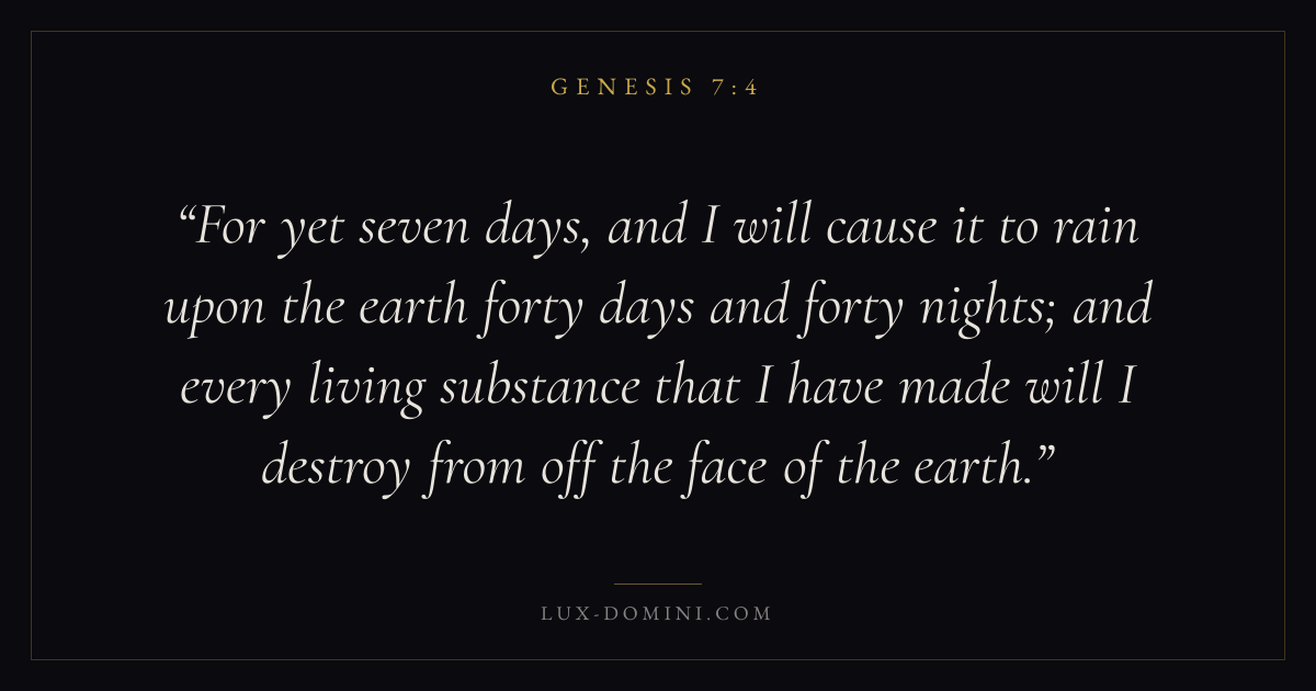 For yet seven days, and I will cause it to rain upon the earth forty days and forty nights; and every living substance that I have made will I destroy from off the face of the earth.