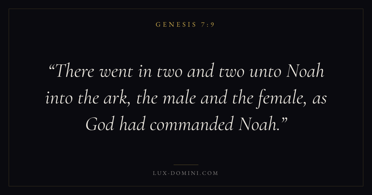 There went in two and two unto Noah into the ark, the male and the female, as God had commanded Noah.