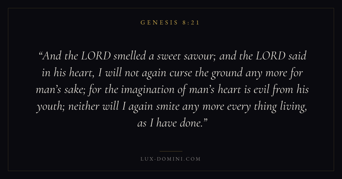 And the LORD smelled a sweet savour; and the LORD said in his heart, I will not again curse the ground any more for man’s sake; for the imagination of man’s heart is evil from his youth; neither will I again smite any more every thing living, as I have done.