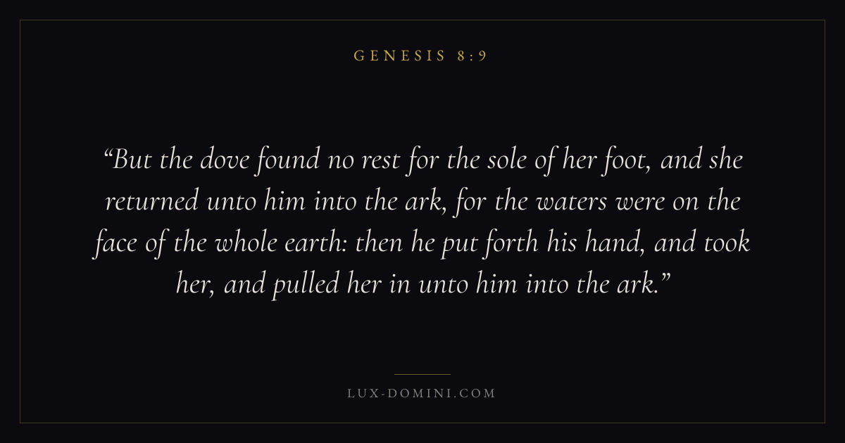 But the dove found no rest for the sole of her foot, and she returned unto him into the ark, for the waters were on the face of the whole earth: then he put forth his hand, and took her, and pulled her in unto him into the ark.