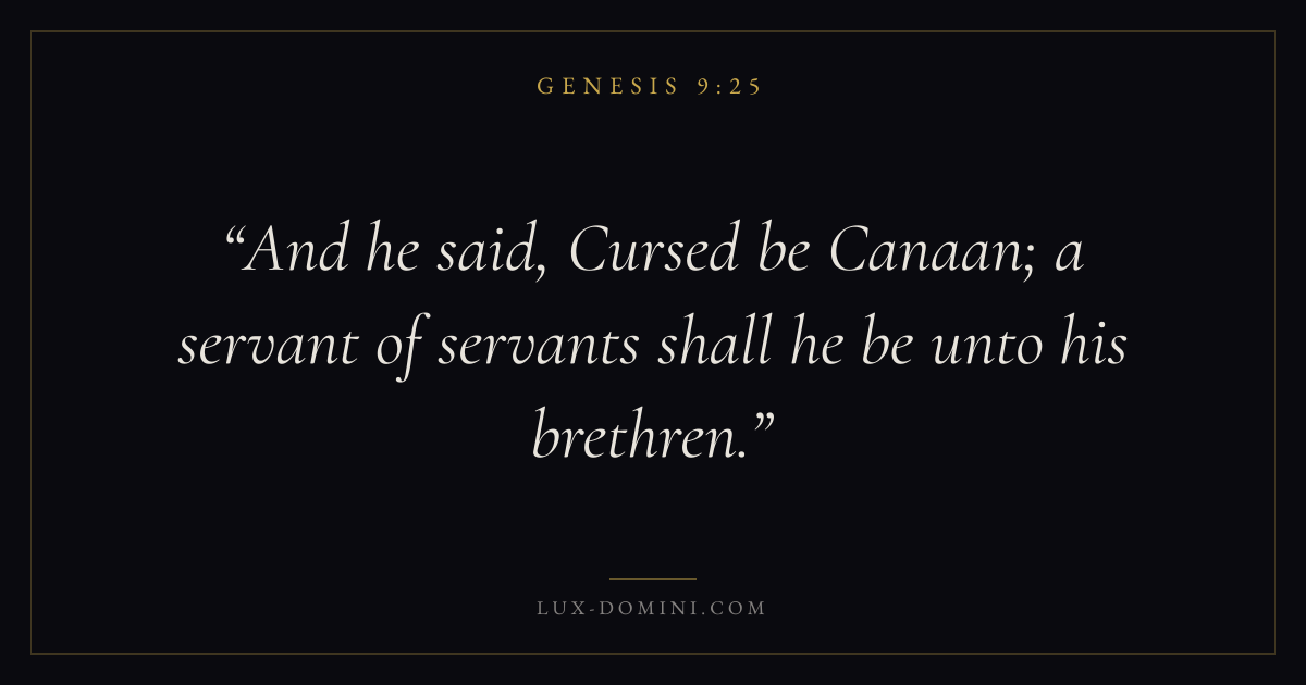Books / Genesis / Chapter 9 / Verse 25 ← Genesis 9:24 Genesis 9:25 Genesis 9:26 → And he said, Cursed be Canaan; a servant of servants shall he be unto his brethren. Download verse card Share on Twitter Share on Facebook Pin it ✦ Key themes HopePeaceCreationFall Read with Genesis 9:24Genesis 9:26Romans 8:24Revelation 21:4 Related topics Bible verses about hopeBible verses about peace ✦ Genesis Chapter 9 verses V. 1 V. 2 V. 3 V. 4 V. 5 V. 6 V. 7 V. 8 V. 9 V. 10 V. 11 V. 12 V. 13 V. 14 V. 15 V. 16 V. 17 V. 18 V. 19 V. 20 V. 21 V. 22 V. 23 V. 24 V. 25 V. 26 V. 27 V. 28 V. 29