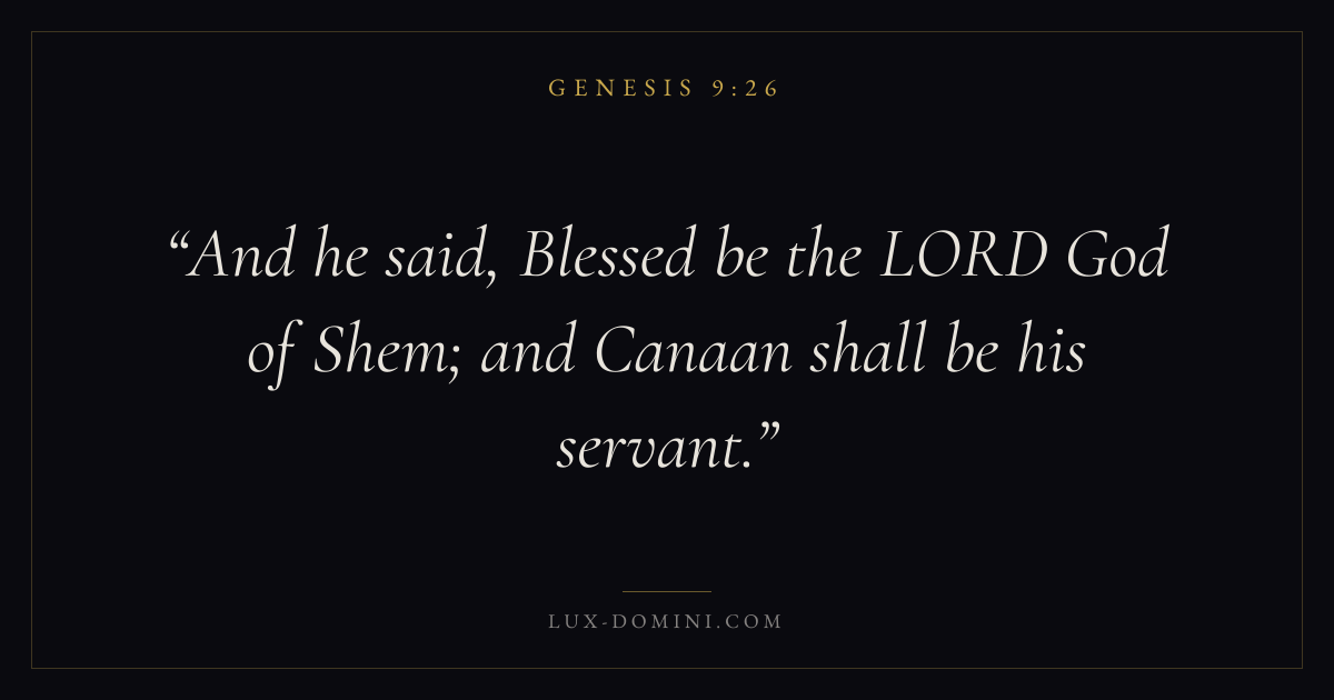 Books / Genesis / Chapter 9 / Verse 26 ← Genesis 9:25 Genesis 9:26 Genesis 9:27 → And he said, Blessed be the LORD God of Shem; and Canaan shall be his servant. Download verse card Share on Twitter Share on Facebook Pin it ✦ Key themes HopePeaceCreationFall Read with Genesis 9:24Genesis 9:25Romans 8:24Revelation 21:4 Related topics Bible verses about hopeBible verses about peace Glossary Shem Person A name; renown, the first mentioned of the sons of Noah ( Gen. 5:32 ; 6:10 ). He was probably the eldest of Noah’s sons. The words “brother of Japheth the elder” in Gen. ✦ Genesis Chapter 9 verses V. 1 V. 2 V. 3 V. 4 V. 5 V. 6 V. 7 V. 8 V. 9 V. 10 V. 11 V. 12 V. 13 V. 14 V. 15 V. 16 V. 17 V. 18 V. 19 V. 20 V. 21 V. 22 V. 23 V. 24 V. 25 V. 26 V. 27 V. 28 V. 29