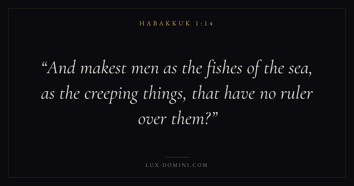 Books / Habakkuk / Chapter 1 / Verse 14 ← Habakkuk 1:13 Habakkuk 1:14 Habakkuk 1:15 → And makest men as the fishes of the sea, as the creeping things, that have no ruler over them? Download verse card Share on Twitter Share on Facebook Pin it ✦ Key themes FaithHopeJustice and mercyJustice Read with Habakkuk 1:12Habakkuk 1:13Hebrews 11:1Romans 10:17 Related topics Bible verses about faithBible verses about hopeBible verses about justice and mercy ✦ Habakkuk Chapter 1 verses V. 1 V. 2 V. 3 V. 4 V. 5 V. 6 V. 7 V. 8 V. 9 V. 10 V. 11 V. 12 V. 13 V. 14 V. 15 V. 16 V. 17