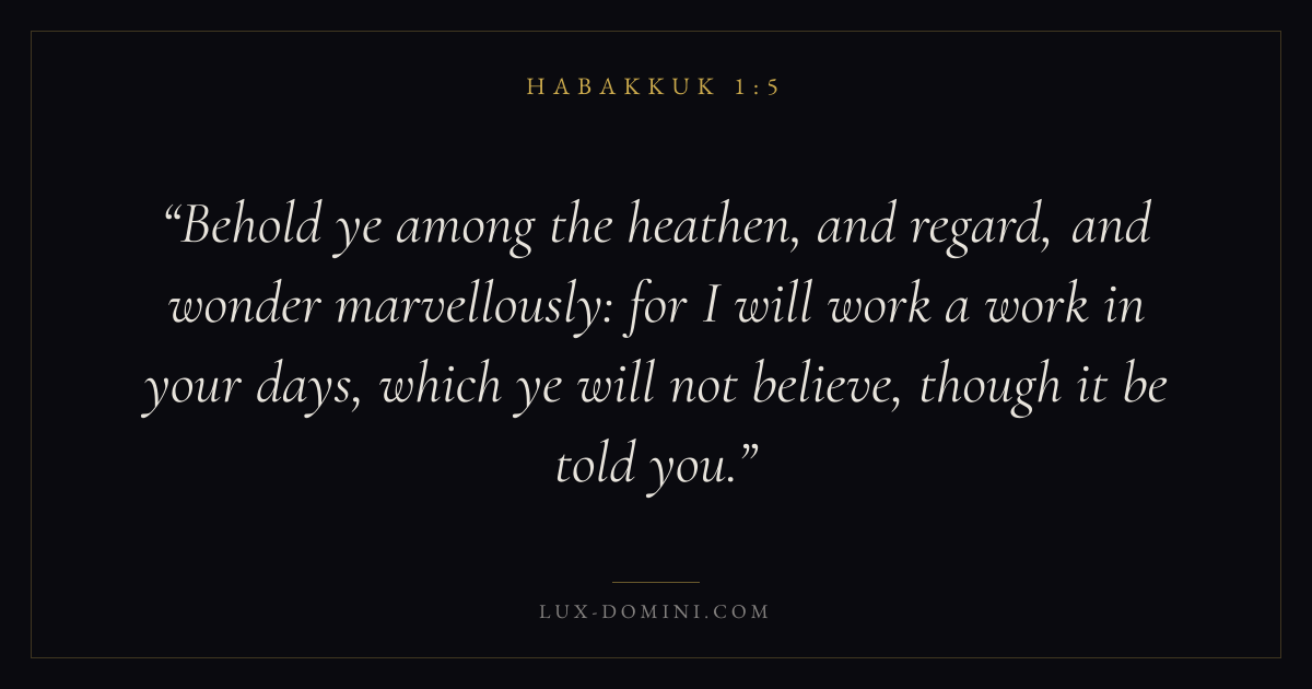 Behold ye among the heathen, and regard, and wonder marvellously: for I will work a work in your days, which ye will not believe, though it be told you.