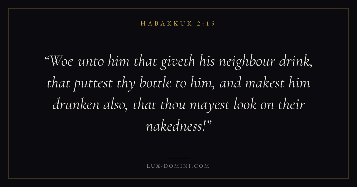 Woe unto him that giveth his neighbour drink, that puttest thy bottle to him, and makest him drunken also, that thou mayest look on their nakedness!