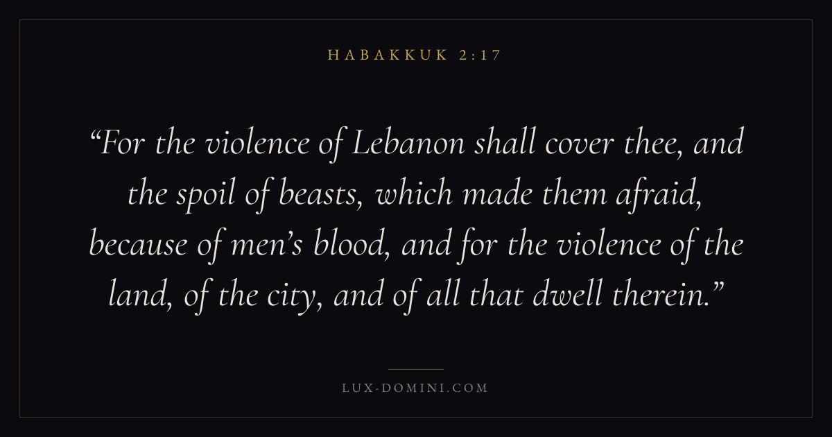 For the violence of Lebanon shall cover thee, and the spoil of beasts, which made them afraid, because of men’s blood, and for the violence of the land, of the city, and of all that dwell therein.