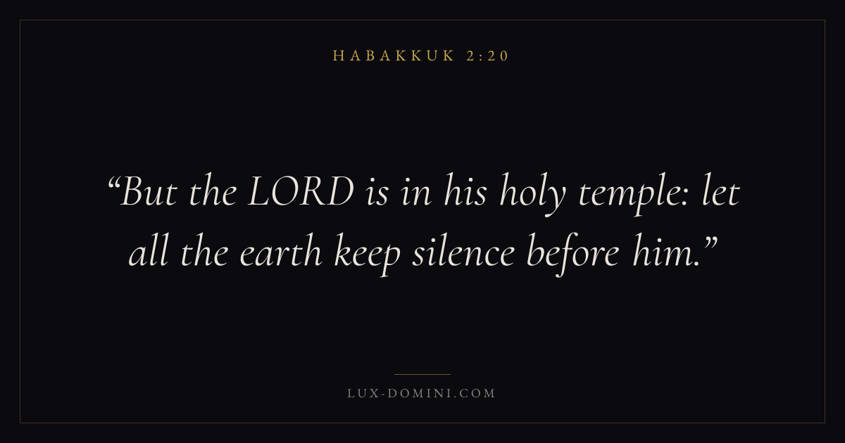 Books / Habakkuk / Chapter 2 / Verse 20 ← Habakkuk 2:19 Habakkuk 2:20 Habakkuk 3:1 → But the LORD is in his holy temple: let all the earth keep silence before him. Download verse card Share on Twitter Share on Facebook Pin it ✦ Key themes FaithHopeJustice and mercyJustice Read with Habakkuk 2:18Habakkuk 2:19Hebrews 11:1Romans 10:17 Related topics Bible verses about faithBible verses about hopeBible verses about justice and mercy ✦ Habakkuk Chapter 2 verses V. 1 V. 2 V. 3 V. 4 V. 5 V. 6 V. 7 V. 8 V. 9 V. 10 V. 11 V. 12 V. 13 V. 14 V. 15 V. 16 V. 17 V. 18 V. 19 V. 20