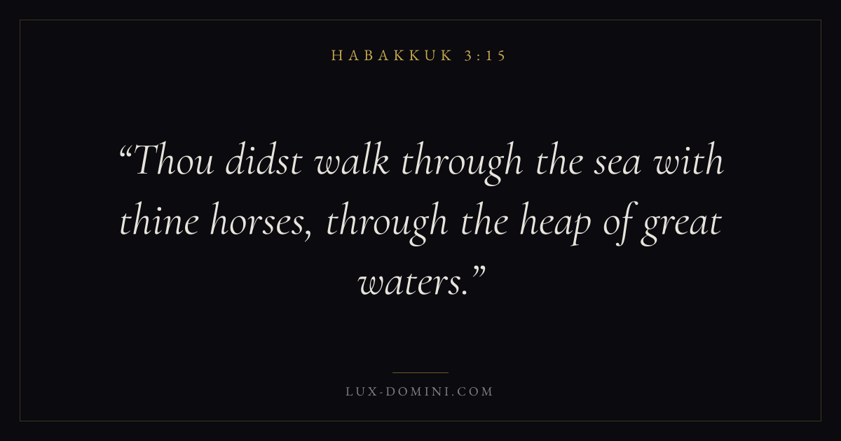 Books / Habakkuk / Chapter 3 / Verse 15 ← Habakkuk 3:14 Habakkuk 3:15 Habakkuk 3:16 → Thou didst walk through the sea with thine horses, through the heap of great waters. Download verse card Share on Twitter Share on Facebook Pin it ✦ Key themes FaithHopePrayerJustice and mercyJustice Read with Habakkuk 3:13Habakkuk 3:14Hebrews 11:1Romans 10:17 Related topics Bible verses about faithBible verses about hopeBible verses about prayerBible verses about justice and mercy ✦ Habakkuk Chapter 3 verses V. 1 V. 2 V. 3 V. 4 V. 5 V. 6 V. 7 V. 8 V. 9 V. 10 V. 11 V. 12 V. 13 V. 14 V. 15 V. 16 V. 17 V. 18 V. 19