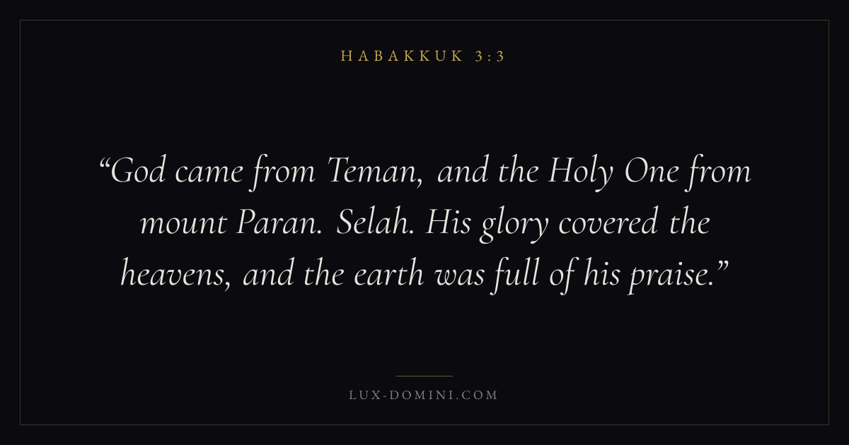God came from Teman, and the Holy One from mount Paran. Selah. His glory covered the heavens, and the earth was full of his praise.