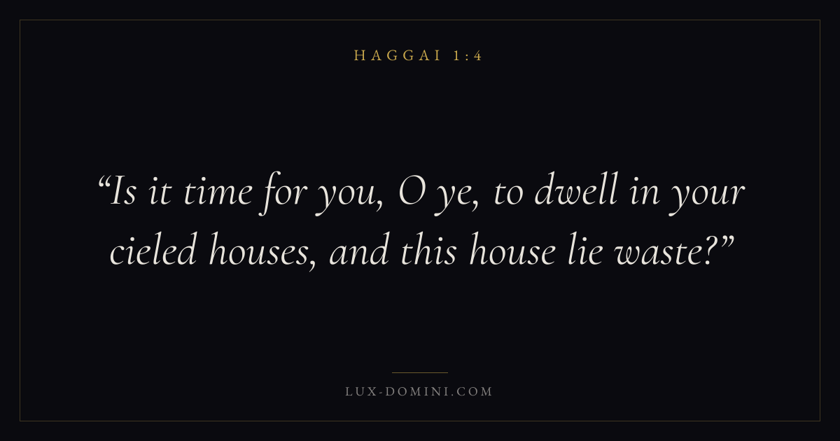 Books / Haggai / Chapter 1 / Verse 4 ← Haggai 1:3 Haggai 1:4 Haggai 1:5 → Is it time for you, O ye, to dwell in your cieled houses, and this house lie waste? Download verse card Share on Twitter Share on Facebook Pin it ✦ Key themes PriorityTempleEncouragementPurity Read with Haggai 1:1Haggai 1:2 ✦ Haggai Chapter 1 verses V. 1 V. 2 V. 3 V. 4 V. 5 V. 6 V. 7 V. 8 V. 9 V. 10 V. 11 V. 12 V. 13 V. 14 V. 15