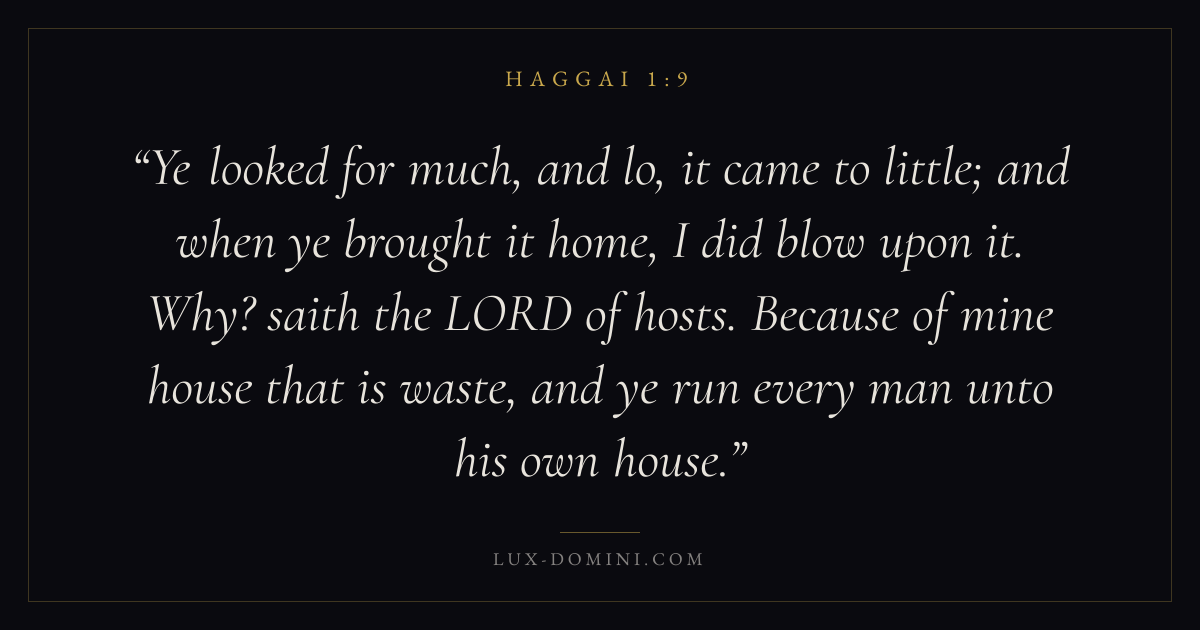 Ye looked for much, and lo, it came to little; and when ye brought it home, I did blow upon it. Why? saith the LORD of hosts. Because of mine house that is waste, and ye run every man unto his own house.