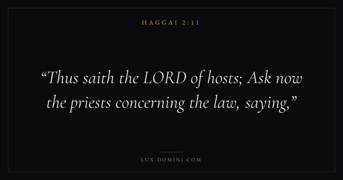 Books / Haggai / Chapter 2 / Verse 11 ← Haggai 2:10 Haggai 2:11 Haggai 2:12 → Thus saith the LORD of hosts; Ask now the priests concerning the law, saying, Download verse card Share on Twitter Share on Facebook Pin it ✦ Key themes PrayerPriorityTempleEncouragement Read with Haggai 2:10Haggai 2:12Matthew 6:9Luke 18:1 Related topics Bible verses about prayer ✦ Haggai Chapter 2 verses V. 1 V. 2 V. 3 V. 4 V. 5 V. 6 V. 7 V. 8 V. 9 V. 10 V. 11 V. 12 V. 13 V. 14 V. 15 V. 16 V. 17 V. 18 V. 19 V. 20 V. 21 V. 22 V. 23