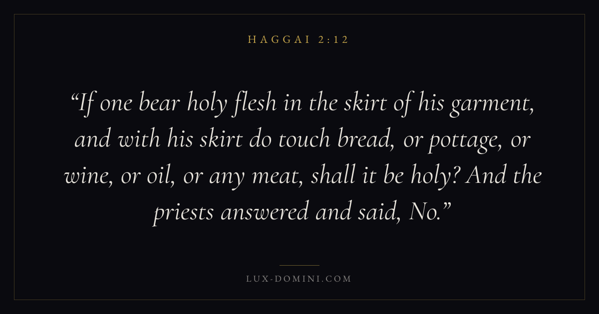 If one bear holy flesh in the skirt of his garment, and with his skirt do touch bread, or pottage, or wine, or oil, or any meat, shall it be holy? And the priests answered and said, No.