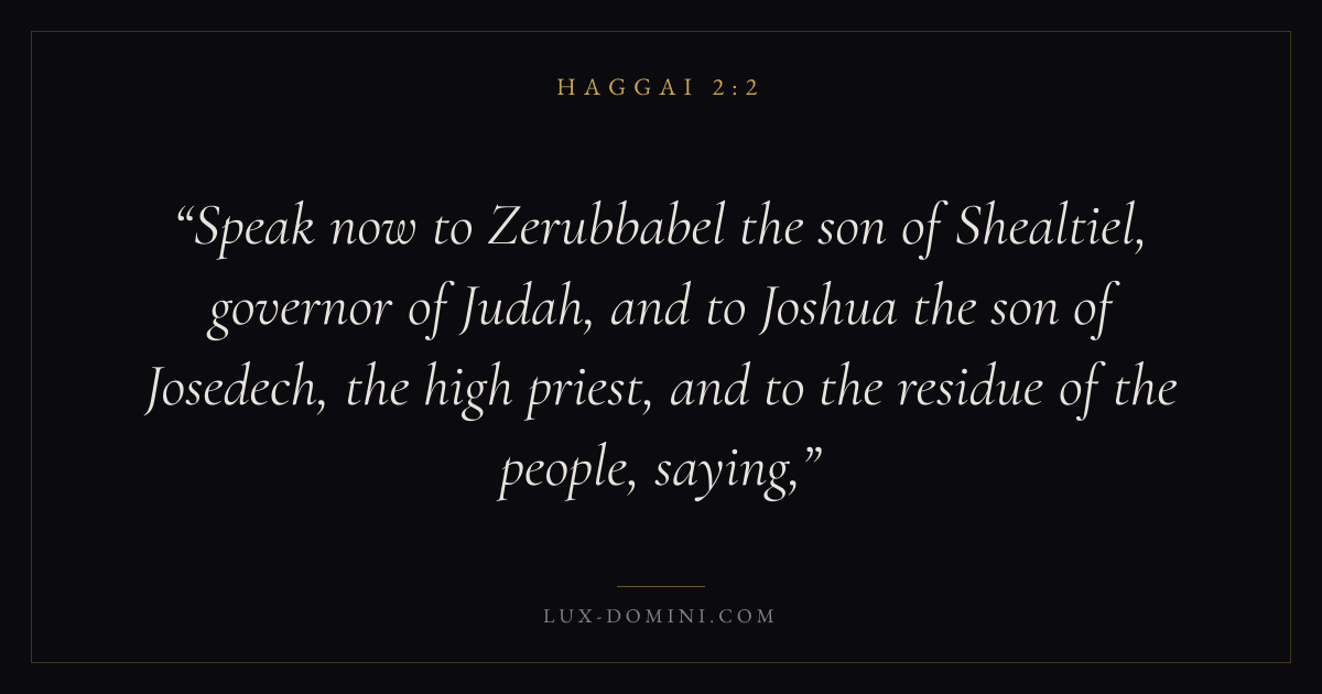 Speak now to Zerubbabel the son of Shealtiel, governor of Judah, and to Joshua the son of Josedech, the high priest, and to the residue of the people, saying,