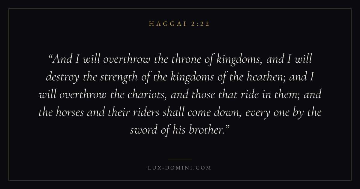 And I will overthrow the throne of kingdoms, and I will destroy the strength of the kingdoms of the heathen; and I will overthrow the chariots, and those that ride in them; and the horses and their riders shall come down, every one by the sword of his brother.