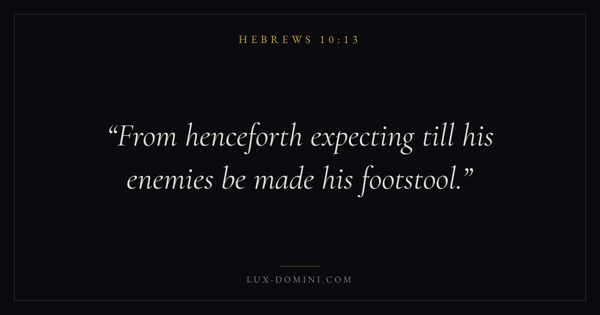 Books / Hebrews / Chapter 10 / Verse 13 ← Hebrews 10:12 Hebrews 10:13 Hebrews 10:14 → From henceforth expecting till his enemies be made his footstool. Download verse card Share on Twitter Share on Facebook Pin it ✦ Key themes FaithForgivenessChristologyPriesthood Read with Hebrews 10:10Hebrews 10:11Hebrews 11:1Romans 10:17 Related topics Bible verses about faithBible verses about forgiveness ✦ Hebrews Chapter 10 verses V. 1 V. 2 V. 3 V. 4 V. 5 V. 6 V. 7 V. 8 V. 9 V. 10 V. 11 V. 12 V. 13 V. 14 V. 15 V. 16 V. 17 V. 18 V. 19 V. 20 V. 21 V. 22 V. 23 V. 24 V. 25 V. 26 V. 27 V. 28 V. 29 V. 30 V. 31 V. 32 V. 33 V. 34 V. 35 V. 36 V. 37 V. 38 V. 39