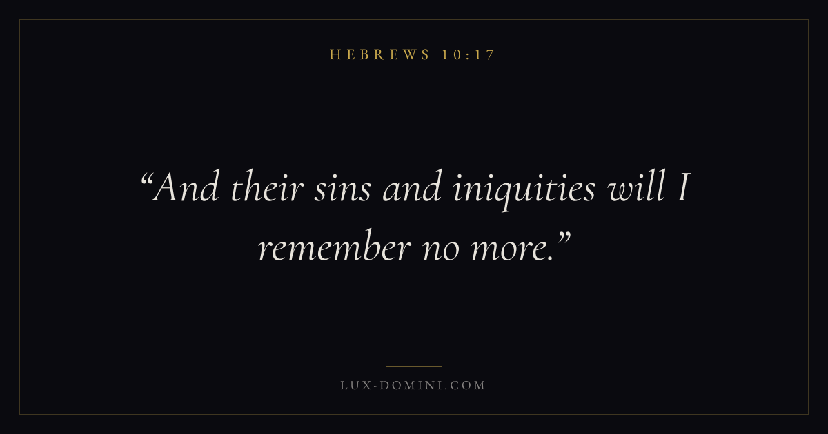 Books / Hebrews / Chapter 10 / Verse 17 ← Hebrews 10:16 Hebrews 10:17 Hebrews 10:18 → And their sins and iniquities will I remember no more. Download verse card Share on Twitter Share on Facebook Pin it ✦ Key themes FaithForgivenessChristologyPriesthood Read with Hebrews 10:15Hebrews 10:16Hebrews 11:1Romans 10:17 Related topics Bible verses about faithBible verses about forgiveness ✦ Hebrews Chapter 10 verses V. 1 V. 2 V. 3 V. 4 V. 5 V. 6 V. 7 V. 8 V. 9 V. 10 V. 11 V. 12 V. 13 V. 14 V. 15 V. 16 V. 17 V. 18 V. 19 V. 20 V. 21 V. 22 V. 23 V. 24 V. 25 V. 26 V. 27 V. 28 V. 29 V. 30 V. 31 V. 32 V. 33 V. 34 V. 35 V. 36 V. 37 V. 38 V. 39