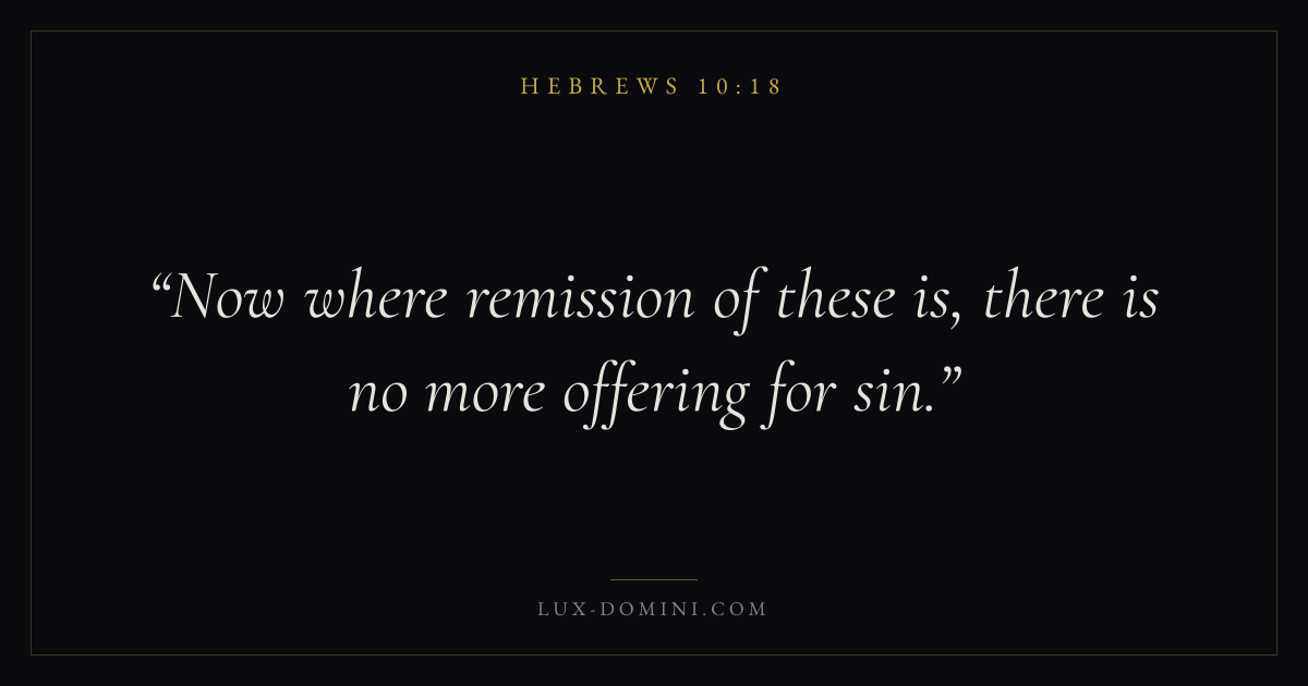 Books / Hebrews / Chapter 10 / Verse 18 ← Hebrews 10:17 Hebrews 10:18 Hebrews 10:19 → Now where remission of these is, there is no more offering for sin. Download verse card Share on Twitter Share on Facebook Pin it ✦ Key themes FaithForgivenessChristologyPriesthood Read with Hebrews 10:15Hebrews 10:16Hebrews 11:1Romans 10:17 Related topics Bible verses about faithBible verses about forgiveness ✦ Hebrews Chapter 10 verses V. 1 V. 2 V. 3 V. 4 V. 5 V. 6 V. 7 V. 8 V. 9 V. 10 V. 11 V. 12 V. 13 V. 14 V. 15 V. 16 V. 17 V. 18 V. 19 V. 20 V. 21 V. 22 V. 23 V. 24 V. 25 V. 26 V. 27 V. 28 V. 29 V. 30 V. 31 V. 32 V. 33 V. 34 V. 35 V. 36 V. 37 V. 38 V. 39