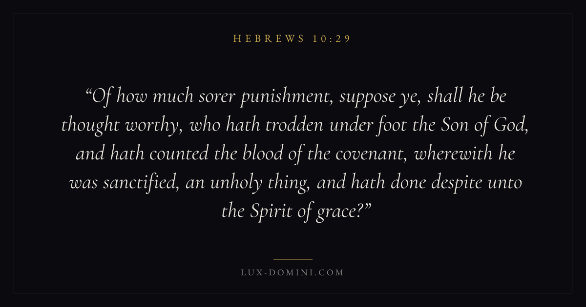 Of how much sorer punishment, suppose ye, shall he be thought worthy, who hath trodden under foot the Son of God, and hath counted the blood of the covenant, wherewith he was sanctified, an unholy thing, and hath done despite unto the Spirit of grace?