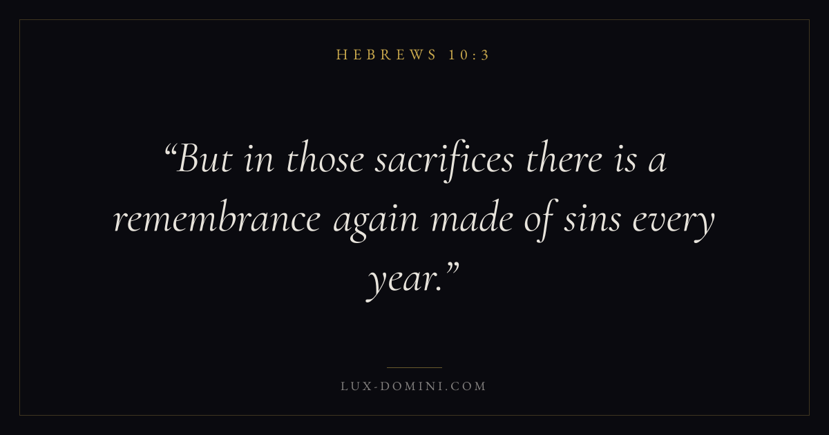 Books / Hebrews / Chapter 10 / Verse 3 ← Hebrews 10:2 Hebrews 10:3 Hebrews 10:4 → But in those sacrifices there is a remembrance again made of sins every year. Download verse card Share on Twitter Share on Facebook Pin it ✦ Key themes FaithForgivenessChristologyPriesthood Read with Hebrews 10:1Hebrews 10:2Hebrews 11:1Romans 10:17 Related topics Bible verses about faithBible verses about forgiveness ✦ Hebrews Chapter 10 verses V. 1 V. 2 V. 3 V. 4 V. 5 V. 6 V. 7 V. 8 V. 9 V. 10 V. 11 V. 12 V. 13 V. 14 V. 15 V. 16 V. 17 V. 18 V. 19 V. 20 V. 21 V. 22 V. 23 V. 24 V. 25 V. 26 V. 27 V. 28 V. 29 V. 30 V. 31 V. 32 V. 33 V. 34 V. 35 V. 36 V. 37 V. 38 V. 39